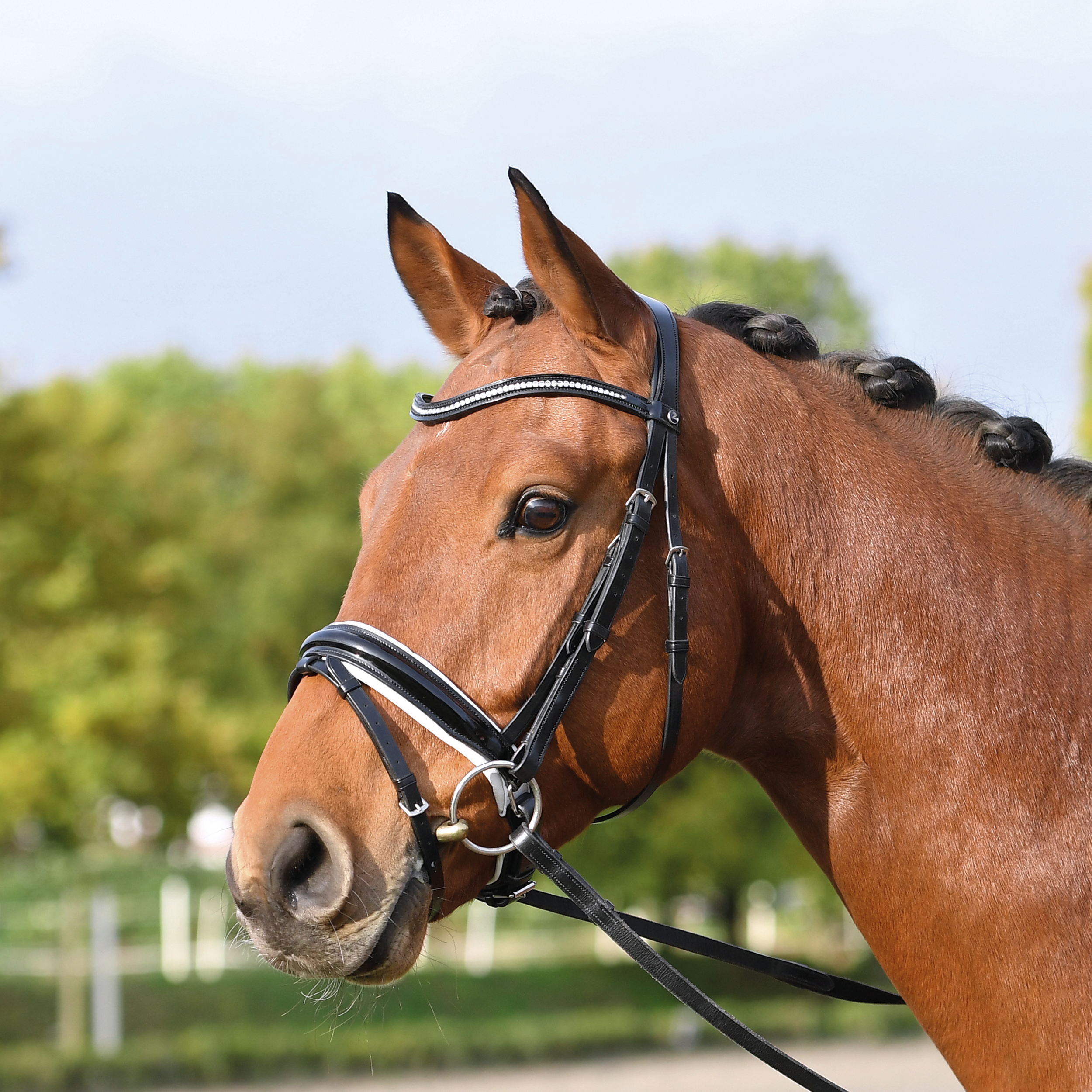 • bardzo szeroki nachrapnik szwedzki, zwężany po bokach, miękko podszyty, z wierzchu skóra lakierowana, sprzączki z tulejami, podkładka pod żuchwę