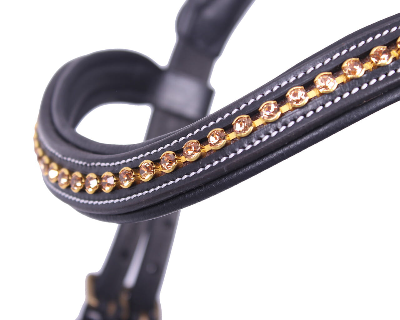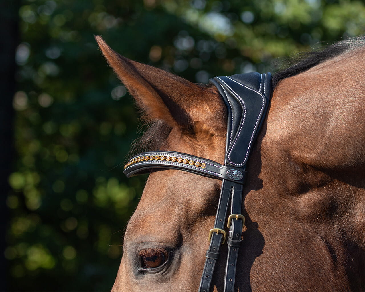 Model wyróżnia się falistym naczółkiem ozdobionym złotymi kryształkami, które dodają mu szykownego charakteru. Dla kontrastu ogłowie wykończono białymi przeszyciami i okuciami w kolorze mosiądzu, co podkreśla jego luksusowy wygląd.