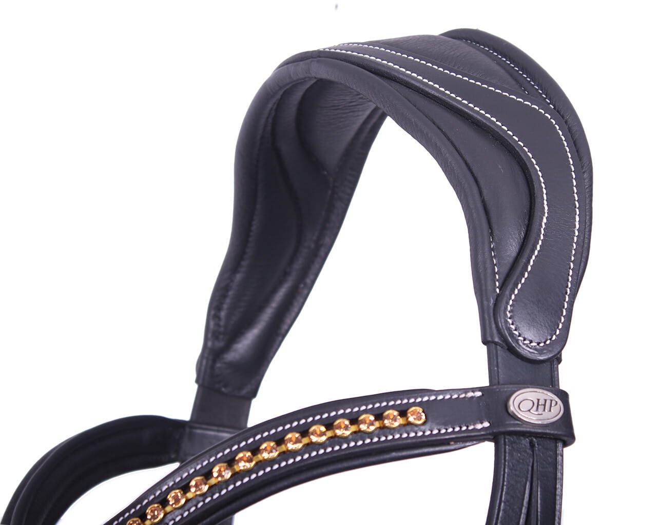 Ogłowie QHP „Devi” to połączenie elegancji, funkcjonalności i najwyższej jakości wykonania. Anatomiczny kształt został zaprojektowany tak, aby zapewnić koniowi maksymalny komfort, zmniejszając nacisk na wrażliwe punkty głowy.