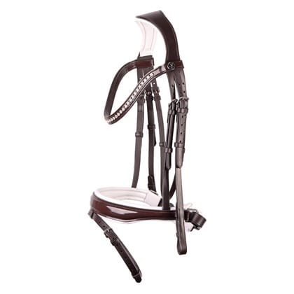 Luksusowe ogłowie wykonane z wysokiej jakości skóry z białym, wyściełanym, błyszczącym nachrapnikiem (4 cm) i naczółkiem w kształcie fali z kryształkami. W zestawie wodze parciane.