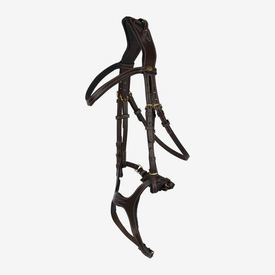 Anatomiczny nagłówek zapobiega obtarciom, a miękkie podszycie pod nachrapnikiem, naczółkiem i nagłówkiem gwarantuje komfort nawet podczas długich treningów. Półokrągły naczółek zapinany na zatrzaski można w razie potrzeby łatwo wymienić. Subtelny, ozdobny haft na nachrapniku nadaje ogłowiu wyjątkowego charakteru, a mosiężne okucia pięknie komponują się z brązową skórą.