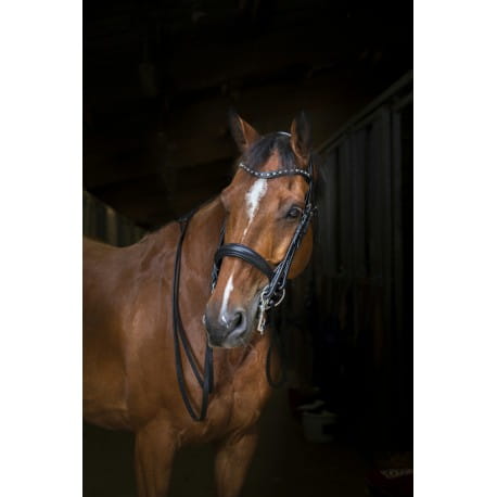 Ogłowie ze skóry bawolej z nagłówkiem i miękkim nachrapnikiem podszytym w kolorze clarino. Naczółek w kształcie litery V ozdobiony czarnymi i przezroczystymi kryształkami. Zapinane na haczyki. Czarne szwy. Klamra ze stali nierdzewnej. Sprzedawane bez wodzy.
