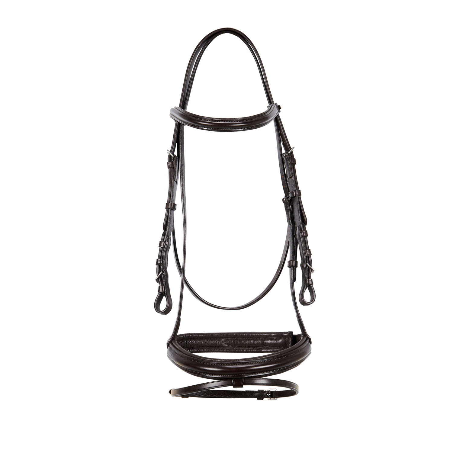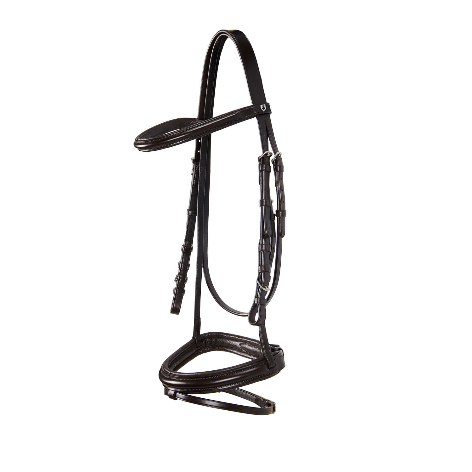 Wysokiej jakości ogłowie z miękkiej skóry i klamry ze stali nierdzewnej zapewniają wytrzymałość i bezpieczeństwo. Wyściełany i regulowany nachrapnik zapewnia maksymalny komfort i idealne dopasowanie. Naczółek ozdobiony logiem Equestro na metalowej blaszce. W komplecie gumowe wodze.