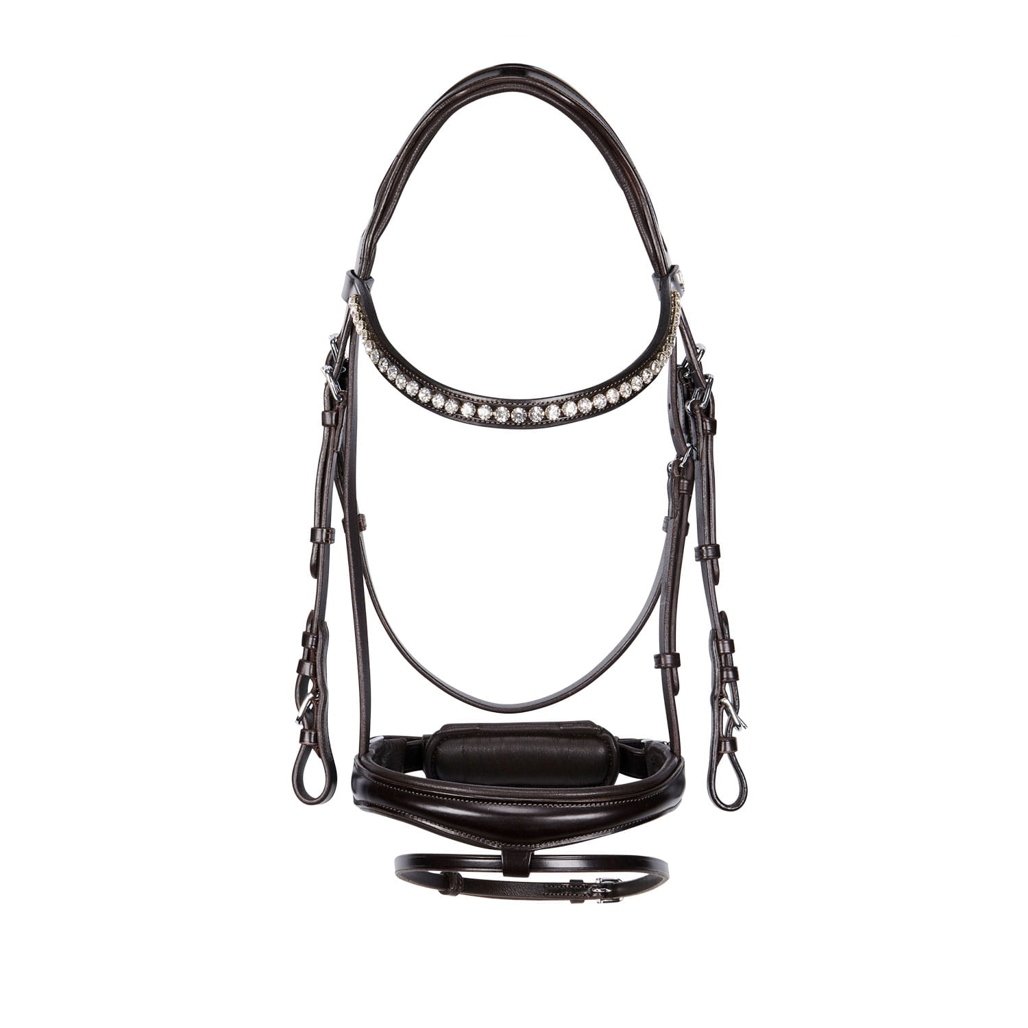 Naczółek, również wyściełany, ozdobiony osadzonymi kryształkami oraz metalową blaszką z logo Equestro.