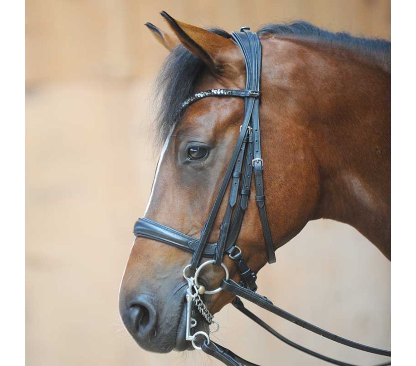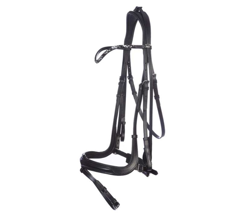 - Szwedzki nachrapnik - wyściełany nachrapnik - bardzo szeroki nachrapnik i duże wycięcie w okolicy wędzidła - boczne paski szyte na okrągło - zakrzywiony naczółek z dużymi białymi cyrkoniami - haczyki w części wędzidła - ze skórzanymi wodzami