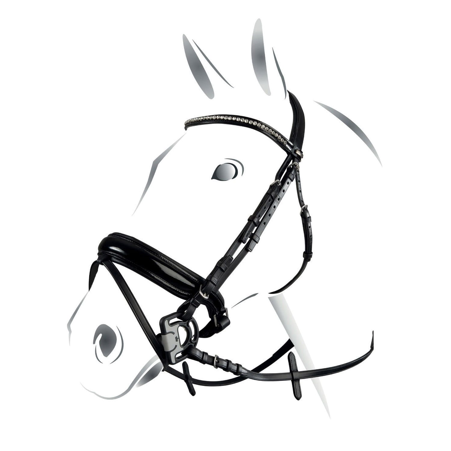 Ogłowie firmy Equestro model NEW CRYSTAL wykonane z wysokiej jakości włoskiej skóry i klamer ze stali nierdzewnej, aby było bardziej odporne. Nachrapnik lakierowany, naczółek lakierowany ozdobiony kryształkami. Logo Equestro na metalowej blaszce z boku. Sprzedawane w komplecie z gumowymi wodzami.