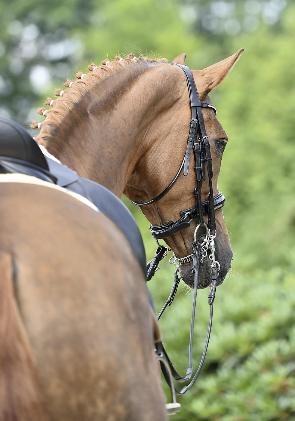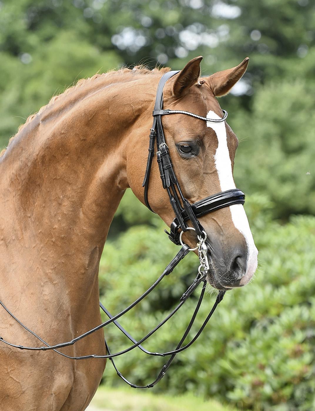 bardzo szeroki nachrapnik szwedzki, zwężany po bokach, miękko podszyty, z wierzchu skóra lakierowana, sprzączki z tulejami, podkładka pod sprzączką na żuchwie