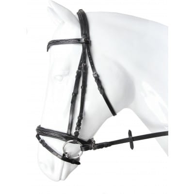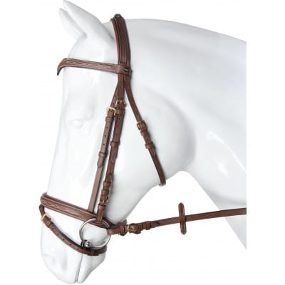 Ogłowie wykonane z wysokiej jakości skóry. Naczółek w kształcie V. Nachrapnik i naczółek ozdobione przeszyciem białą nicią.