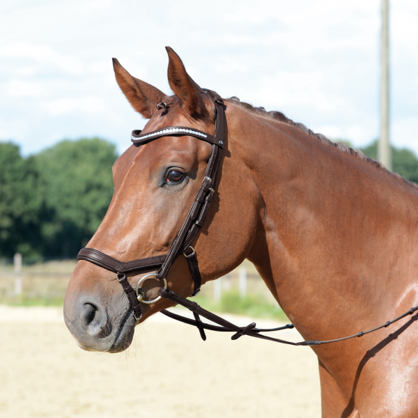 • w komplecie z wodzą z miękkiej skóry, z podwójną liczbą skórzanych stoperów w bardzo małych odstępach dla optymalnego chwytu przy mocno zmieniającej się długości wodzy, z motylkami