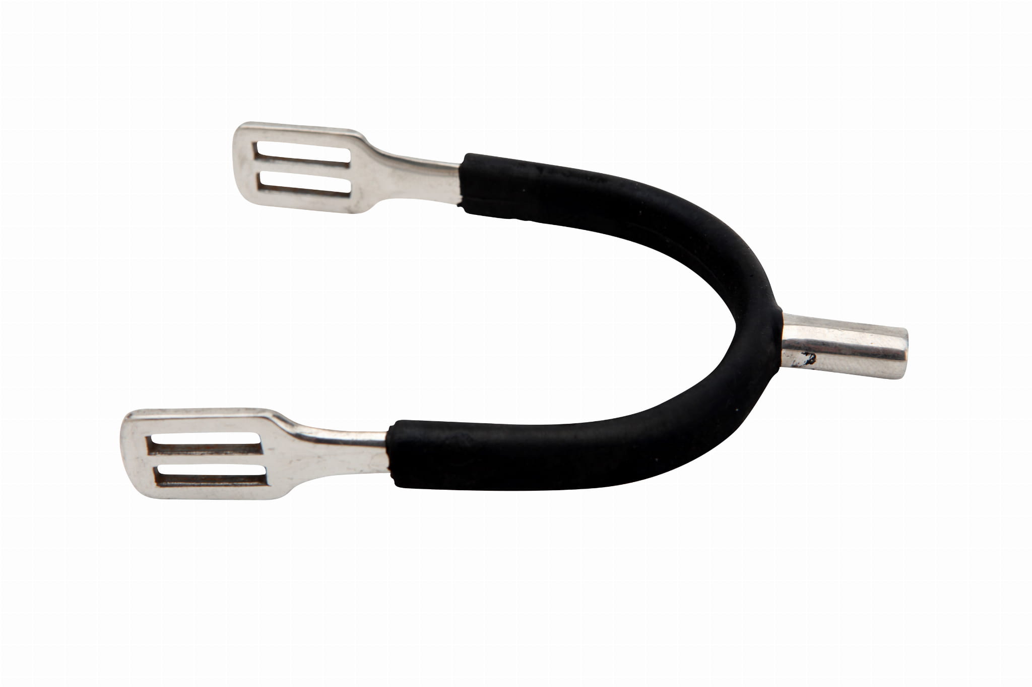 Tępo zakończone ostrogi otoczone gumą chroniącą buty przed uszkodzeniem.