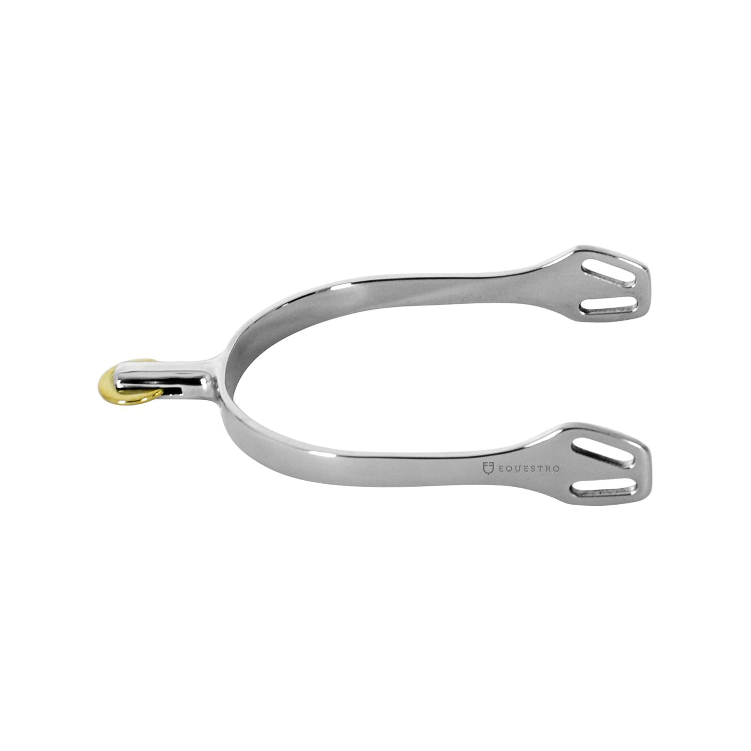 Angielskie ostrogi Equestro unisex z poziomym mosiężnym kółkiem, wykonane ze stali nierdzewnej, aby zapewnić wytrzymałość i funkcjonalność. Idealnie dopasowują się do buta zapewniając prawidłowe osiągi i zapewniając maksymalne dopasowanie, wygodę i ochronę buta. Ozdobiona logo Equestro z boku. Sprzedawane w parach.