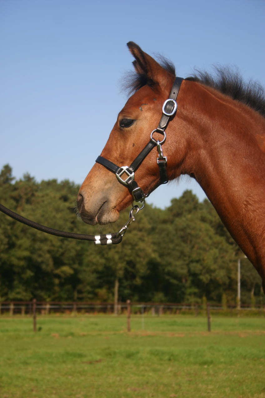 Skórzany kantar źrebięcy z regulacją w części potylicznej oraz przy nachrapniku.