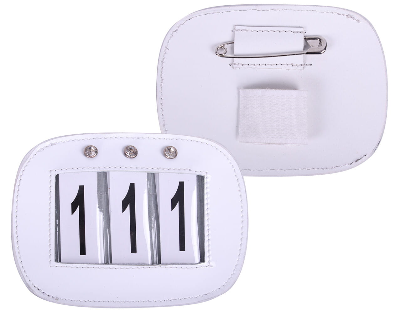 Skórzany pokrowiec na numerek startowy QHP biały – stylowy i praktyczny dodatek na zawody jeździeckie. Wykonany z lakierowanej skóry w eleganckim białym kolorze. Ozdobiony trzema błyszczącymi kryształkami. Idealny do przypięcia do ogłowia lub czapraka.