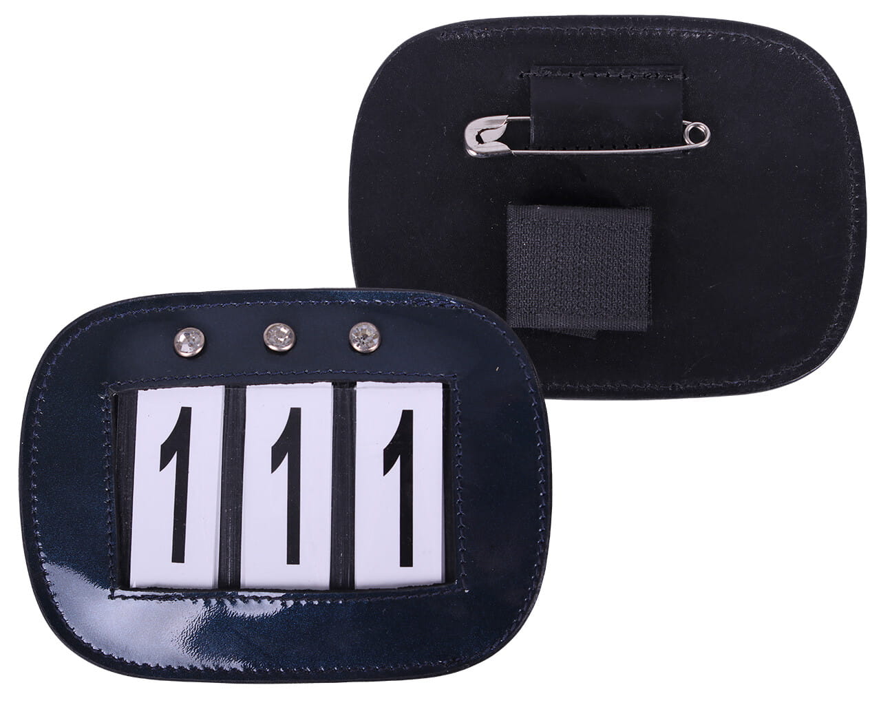 Skórzany pokrowiec na numerek startowy QHP granatowy – elegancki i funkcjonalny dodatek na zawody jeździeckie. Wykonany z lakierowanej skóry, zdobiony trzema subtelnymi kryształkami. Umożliwia wygodne i estetyczne przypięcie numeru startowego do ogłowia lub czapraka.