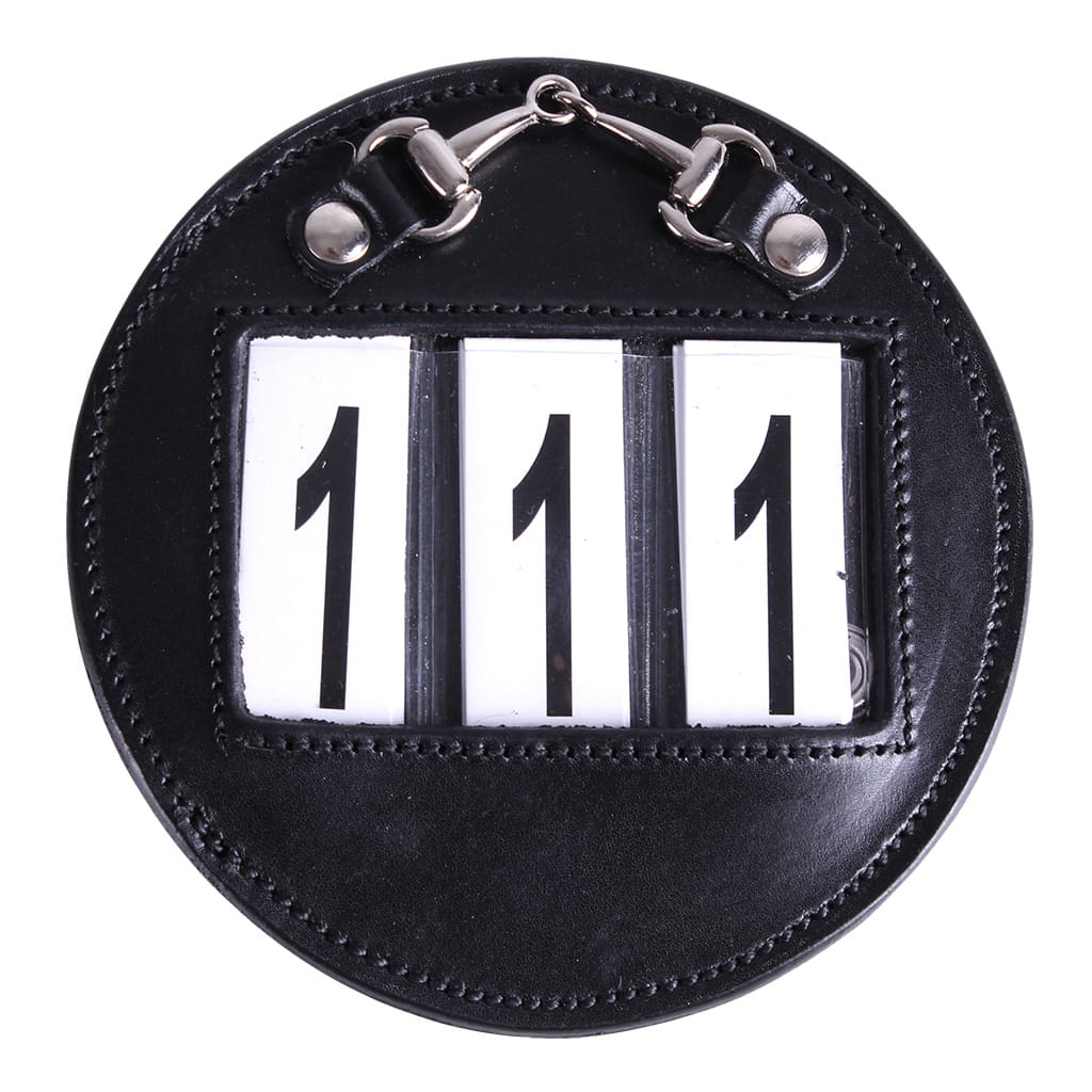 Skórzany pokrowiec na numerek startowy QHP "Ricki" czarny Okrągły, elegancki pokrowiec na numerek startowy wykonany z wysokiej jakości skóry, idealny do łatwego i wygodnego mocowania podczas zawodów.