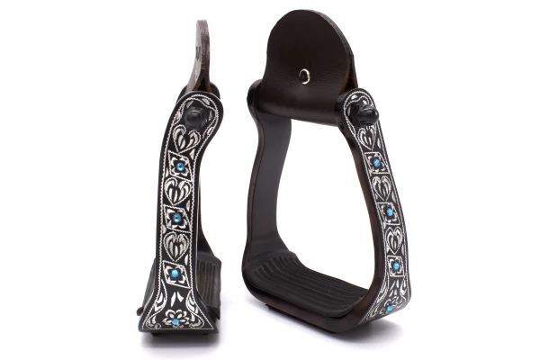 Czarne aluminiowe strzemiona ze srebrnym grawerem i turkusowymi kamieniami.
