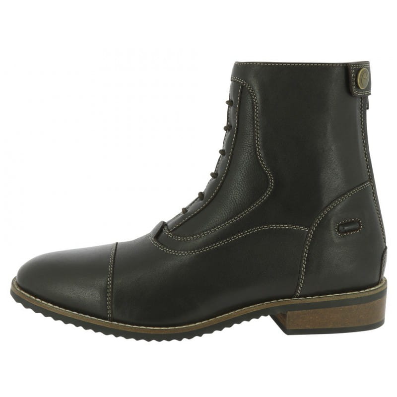 Buty z miękkiej skóry bydlęcej. Sznurowadła z przodu i suwak YKK po bokach ułatwiający zakładanie. Cienkie gumowe podeszwy zewnętrzne.