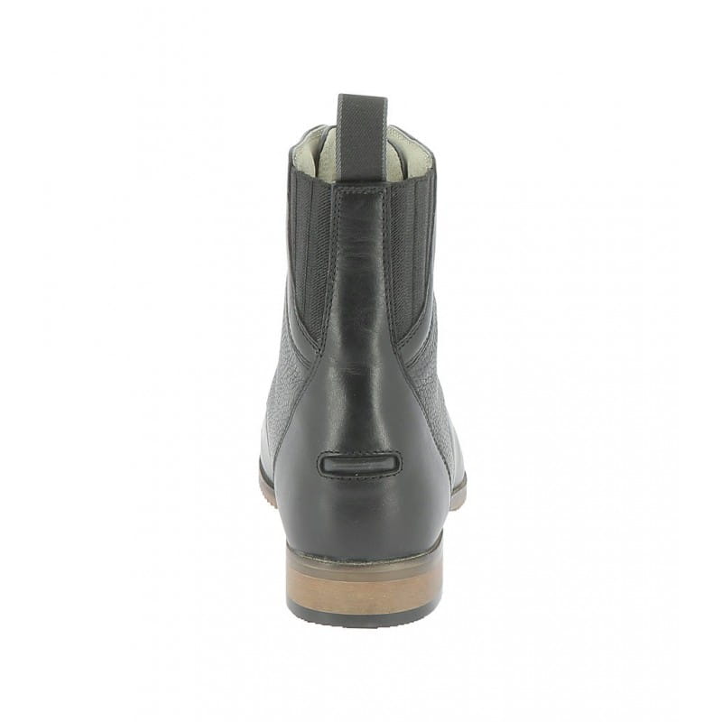 Buty ze skóry bydlęcej. Eleganckie i funkcjonalne. Zamek błyskawiczny YKK na górze i rozciągliwe obszary po obu stronach wzdłuż ścięgien. Błyszczące czarne elementy. Ostroga spoczywa na bokach. Szyte antypoślizgowe podeszwy.