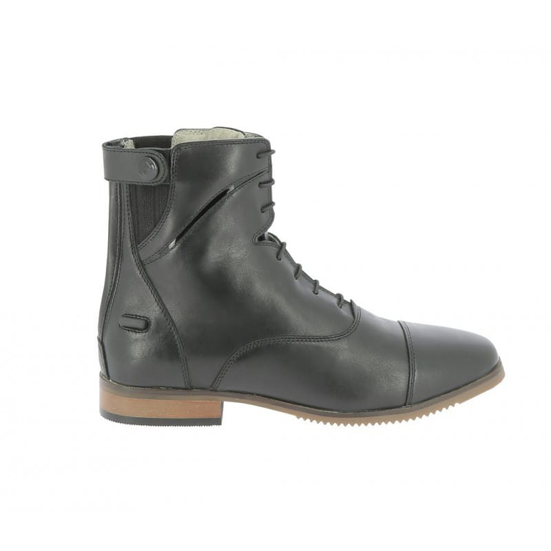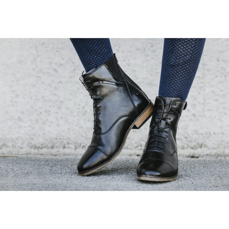 Buty ze skóry bydlęcej. Eleganckie i funkcjonalne. Elastyczne sznurowadła u góry i zamki YKK wzdłuż tylnej części pięt. Błyszczące czarne elementy. Ostroga spoczywa na bokach. Szyte antypoślizgowe podeszwy.