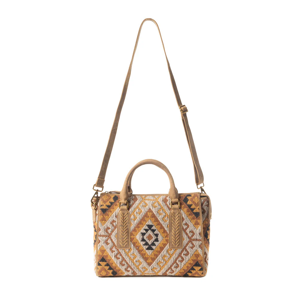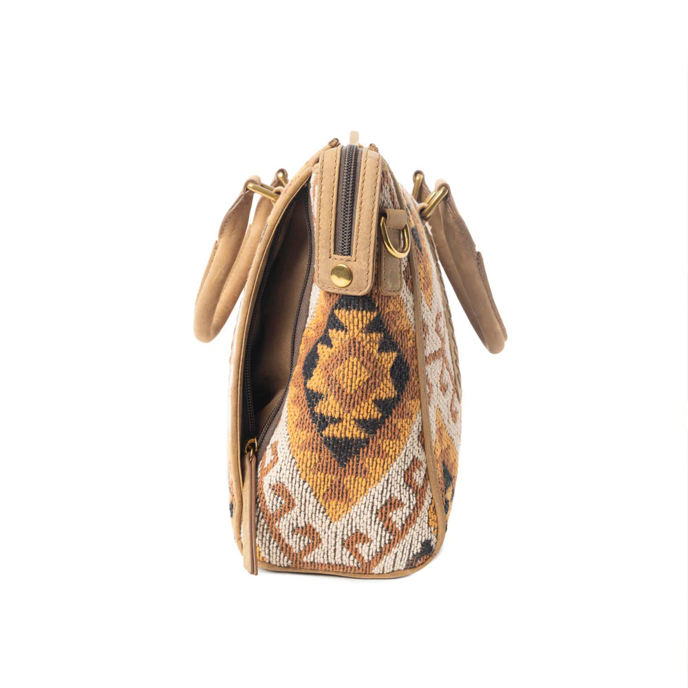 Westernowa torebka damska Myra Bag to idealna propozycja dla kobiet, które cenią styl inspirowany amerykańskim Południowym Zachodem oraz praktyczne rozwiązania na co dzień. Wyrazisty geometryczny wzór w ciepłych odcieniach beżu, kremu i granatu nadaje jej charakteru i sprawia, że przyciąga spojrzenia. Torebka łączy w sobie modny design z funkcjonalnością, dzięki czemu doskonale sprawdzi się zarówno na co dzień, jak i podczas wyjazdów czy spotkań.