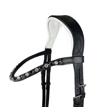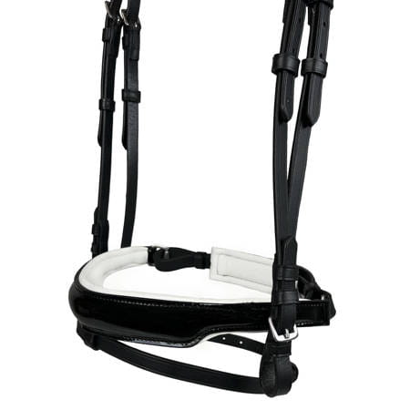 skórzana tranzelka z anatomicznym nachrapnikiem białe, miękkie podszycia na pasku potylicznym oraz nachrapniku zapewniają wyjątkowy wygląd opadający naczółek z dwukolorowymi kryształkami oraz lakierowana skóra na nachrapniku nadają niepowtarzalnego charakteru szeroki, anatomicznie wyprofilowany pasek potyliczny zapewnia lepszy rozkład nacisku oraz swobodę za uszami konia w zestawie z wodzami gumowo-skórzanymi