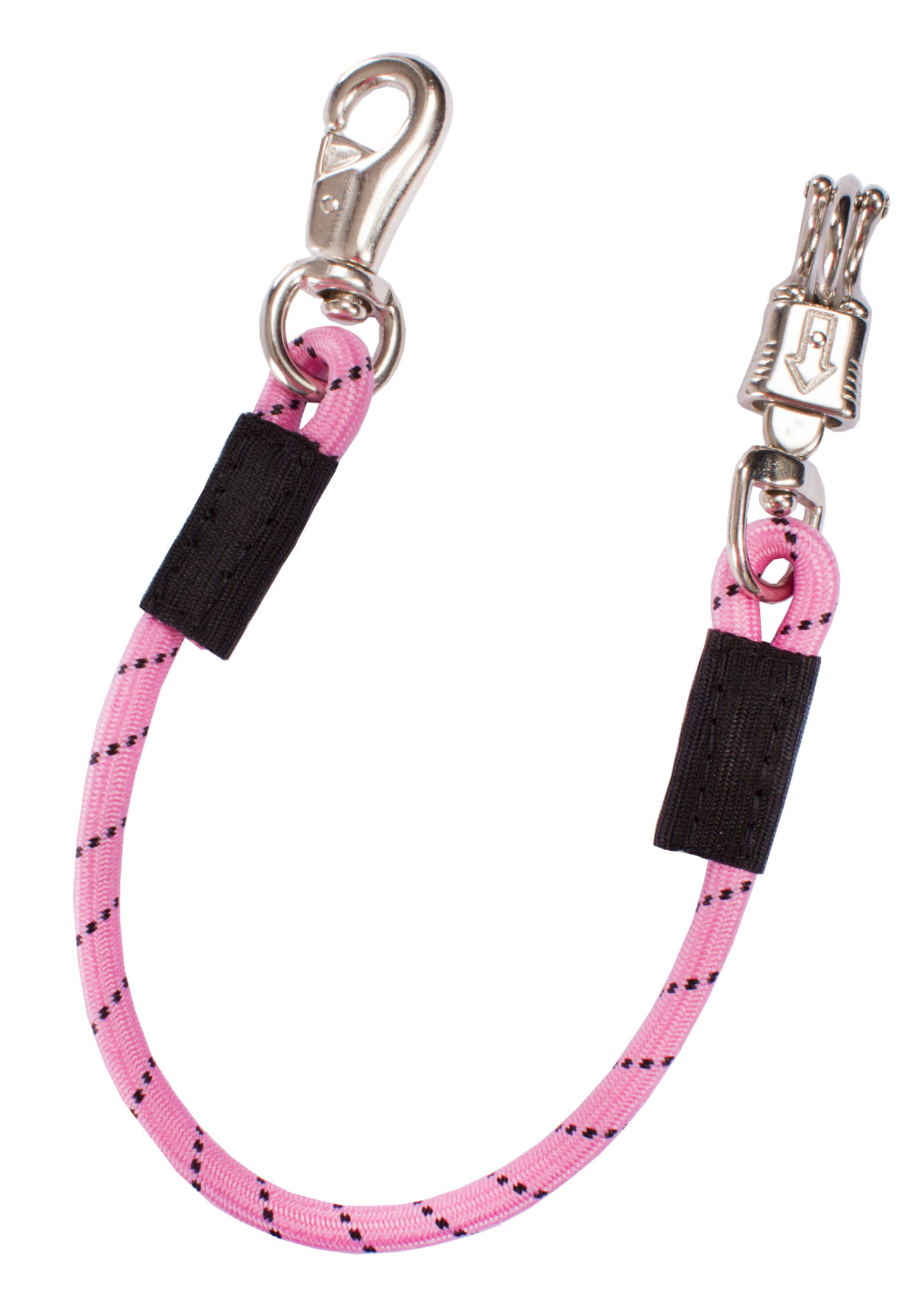 Elastyczny, krótki uwiąz do przyczepy z solidnym karabińczykiem zwykłym i bezpiecznym, wykończony nylonowym paskiem. Praktyczny i bezpieczny w użyciu do zabezpieczenia konia w przyczepie.