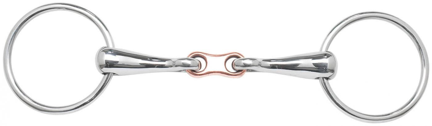 dobrej jakości, ciężkie, masywne wędzidło ze stali szlachetnej podwójnie łamane z płaskim łącznikiem z miedzi nierdzewne, z kółkami ze stali szlachetnej