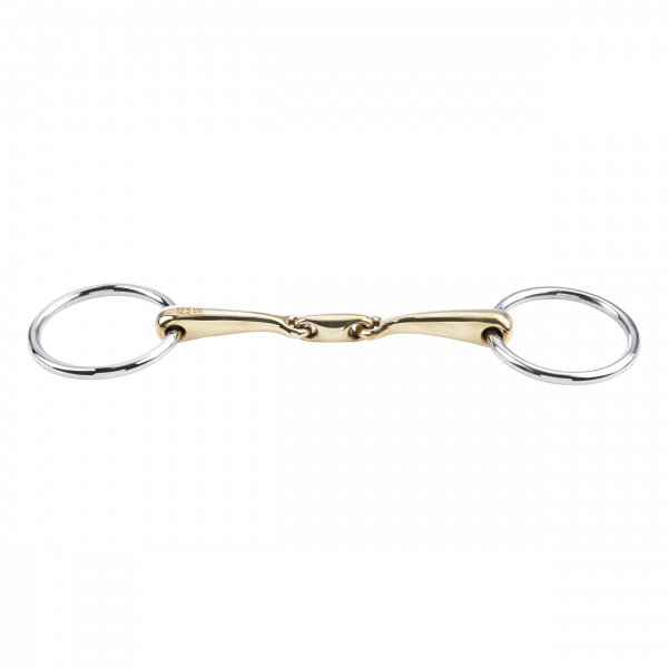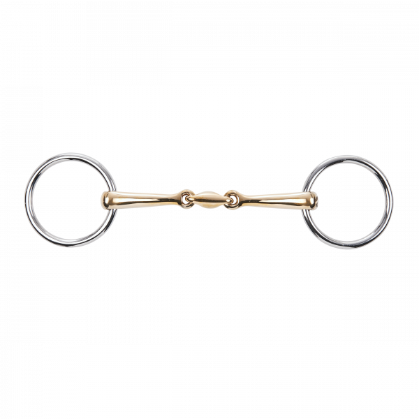 podwójnie łamane z eliptyczną częścią środkową masywny, zapewniający spokojną pozycję w pysku Ustnik wykonany z Kaugan ® dla lepszej akceptacji i wydzielania śliny eliptyczny element środkowy dostosowany do odpowiedniego rozmiaru i wytrzymałości bitu Wszystkie ogniwa łączące są dostosowane do odpowiedniego rozmiaru i siły zgryzu Pierścienie wykonane ze stali nierdzewnej