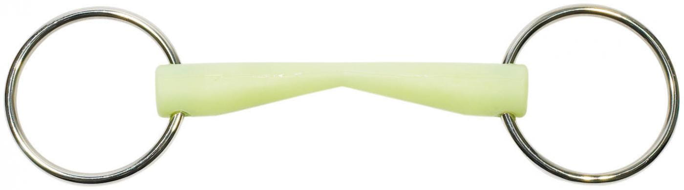 wędzidło z tworzywa sztucznego, bardzo dobra jakość jednoczęściowy, wygięty, elastyczny ścięgierz może być używany opcjonalnie jako ścięgierz prosty lub z wygięciem na język wzmaga żucie smakowe rdzeń i pierścienie ze stali szlachetnej
