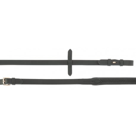 Gumowe wodze z haczykami ze skóry bawolej. Czarne szwy dla czarnej skóry i białe szwy dla skóry brązowej. Klamry w kolorze różowego złota.