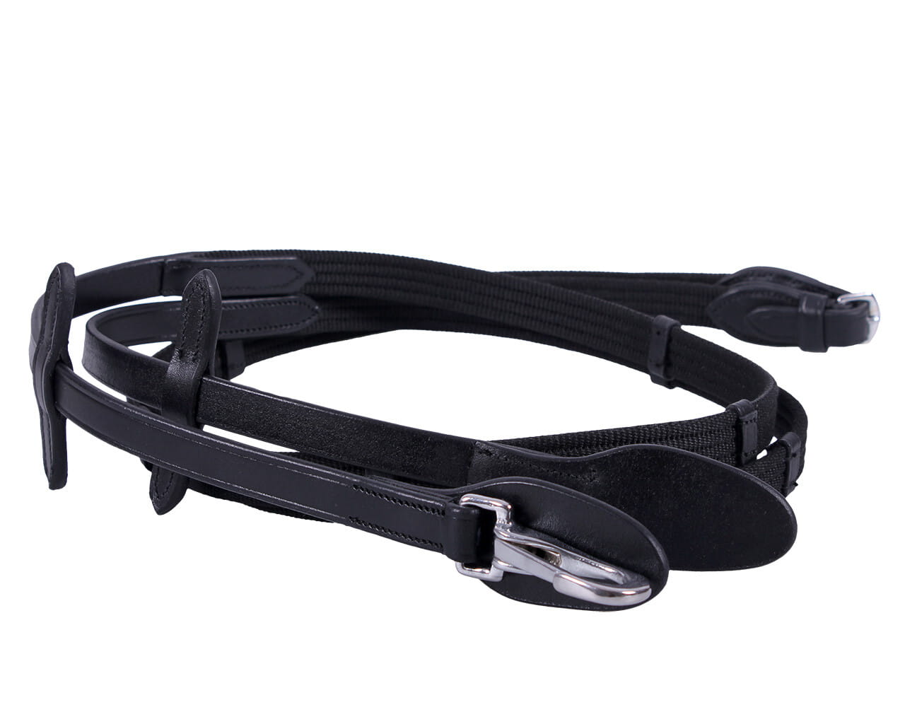 Wodze parciane QHP „Clip” to praktyczne i stylowe rozwiązanie do codziennej jazdy. Dzięki karabińczykom można je szybko przypiąć i wypiąć, co znacząco ułatwia obsługę. Skórzane stopery pomagają utrzymać prawidłową długość wodzy, a naturalna skóra w wykończeniach dodaje trwałości i elegancji.