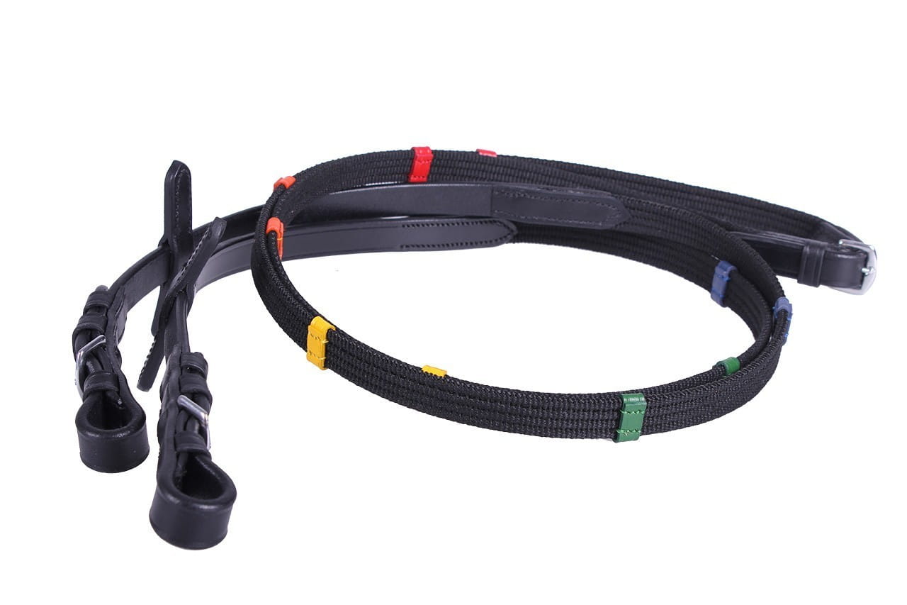 Wodze z kolorowymi stoperami QHP "Coloured Stops" Parciane wodze z kolorowymi, skórzanymi stoperami, które pomagają w nauce jazdy. Wodze posiadają skórzane elementy oraz srebrne okucia, łącząc trwałość z estetyką.