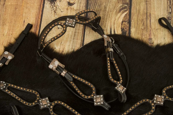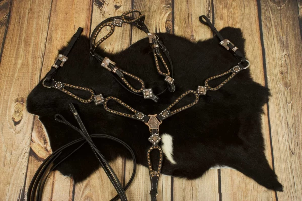 - Grawerowane konchos w kolorze miedzi nadają temu zestawowi wygląd vintage