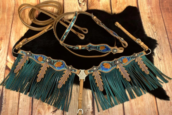 - Nakrycie głowy z dopasowanym napierśnikiem z frędzlami i skórzanymi piórami
